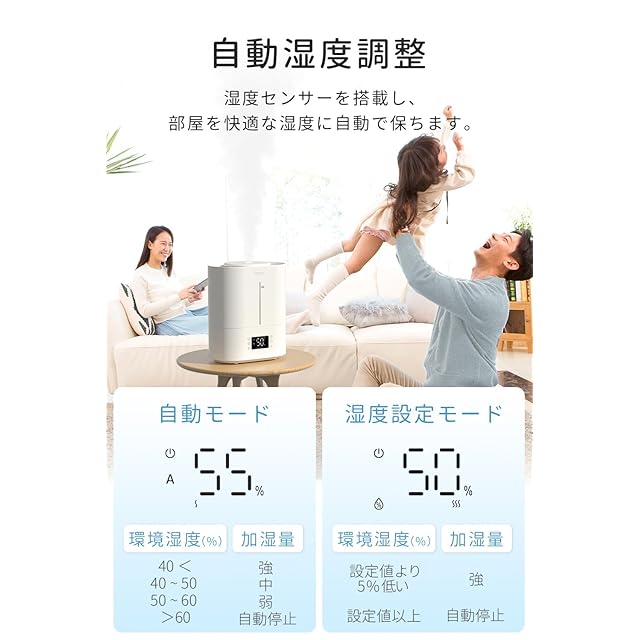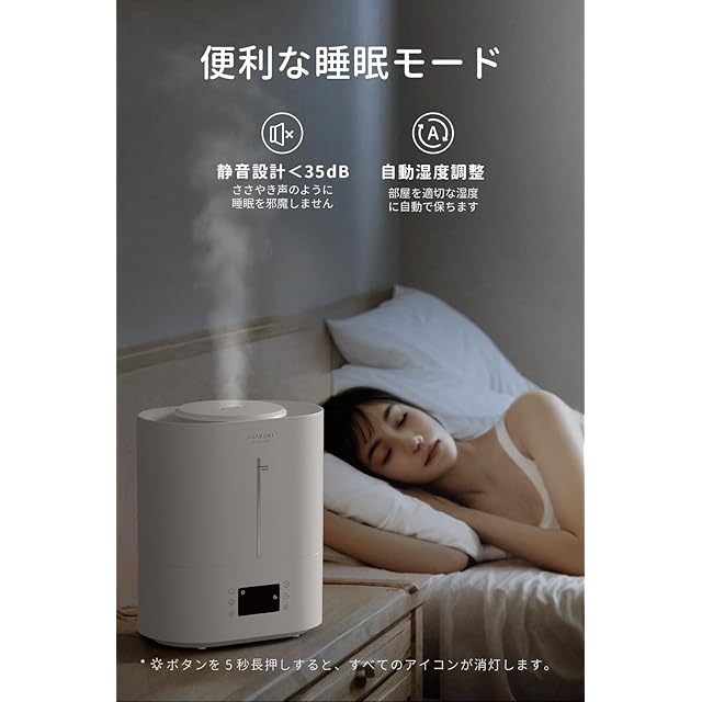 【ワンボタンで自動湿度調整】ASAKUKI超音波加湿器は、湿度センサーを搭載しており、お部屋の湿度を自動でコントロールできます。通常の湿度設定モードに加え、新たに自動モードを追加しました。ワンボタン操作で、湿度を40%〜60%に保つことができるため、非常に簡単で便利です。また、睡眠モードには自動湿度調整機能も備わっており、昼夜を問わず過湿になる心配がありません。