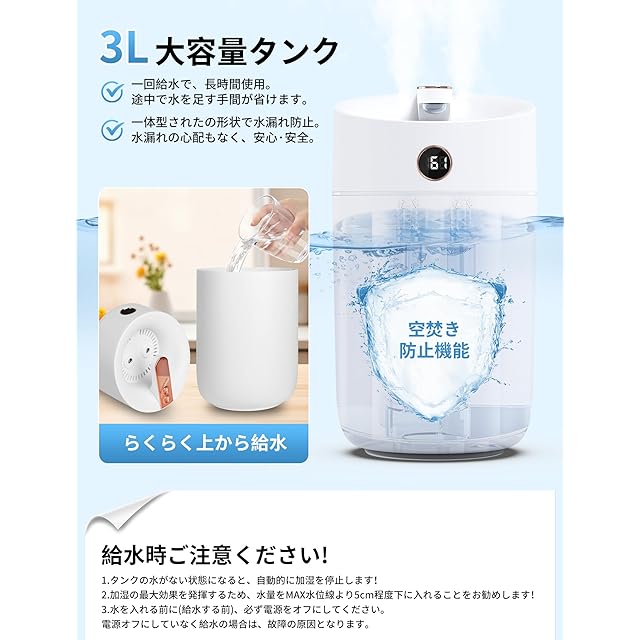【3000mlの大容量水タンク&1日間連続使用】小型加湿器は3000mlの水タンクを使用、一回の給水で最大10時間分の加湿ができ、面倒な給水の手間が大幅に軽減されます。水の量は容器の3分の2以下(上から2.5cmまで)にしてください。満水にするとミストが出にくくなります!また、省エネ技術が採用されており、低消費電力設計のため、長時間使用しても電気代を心配することなく、環境にも経済的です。