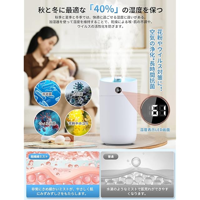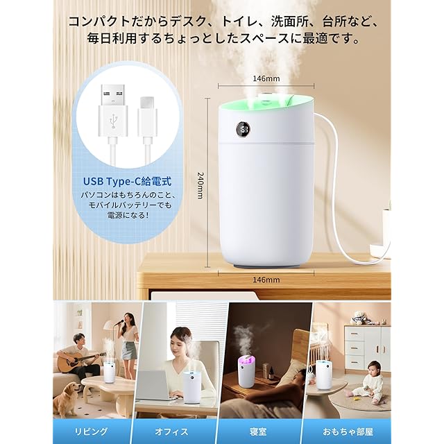 【Type-C給電式加湿器】この超音波加湿器はType-C給電式を採用しており、アダプターだけでなく、パソコンやモバイルバッテリーからも電源がとれるからどこでも使いやすいです。【湿度表示LED画面】加湿器の作動と同時に部屋の湿度をリアルタイムで感知し、データに基づいて部屋の湿度をより快適にコントロールできます。【七色ムードライト】寝るときはムードライトをつけて、七色の眠りをつくります。【使いやすい】秋・冬に、適切な湿度を保ち、花粉対策、鼻・のど・肌の乾燥対策、静電気対策に!持ち運び車用加湿器として、旅行、車用、寝室、オフィスなどに最適です。この季節に必需品である加湿器 は、 誕生日 ギフト 、 新年プレゼント 、 クリスマス ギフトなどにもぴったりです。