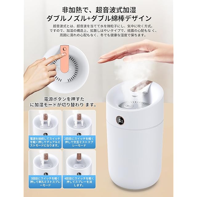 【3種類スチームモード&自動オフタイマー付&空焚き防止】この加湿器は連続モード、間欠モードど左右に切り替噴霧モードの3つ噴霧モードが搭載、1.電源を接続してスイッチを軽く押すとデュアルミストモードになります。2.電源を入れてから2回目にスイッチを軽く押すと交互にスプレーモードになります。3.電源を入れたら3回目にスイッチを軽く押して単孔スプレーモードにします。4.電源を入れたら4回目に軽くスイッチを押してスプレーを消します。より安全性を高めるため、加湿器は10時間経過すると、自動に運転を停止する安全機能付で、うっかり消し忘れても安心です。
