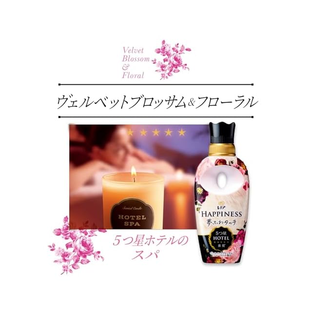 レノアハピネス夢ふわタッチなら5つ星ホテルも認める贅沢な香りが1週間*楽しめます。(*保管状態にて) ヴェルベットブロッサム&フローラルの香りは、ピンクフローラルとバニラが織りなす魅惑の香り。
