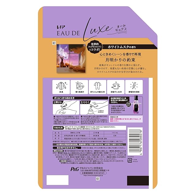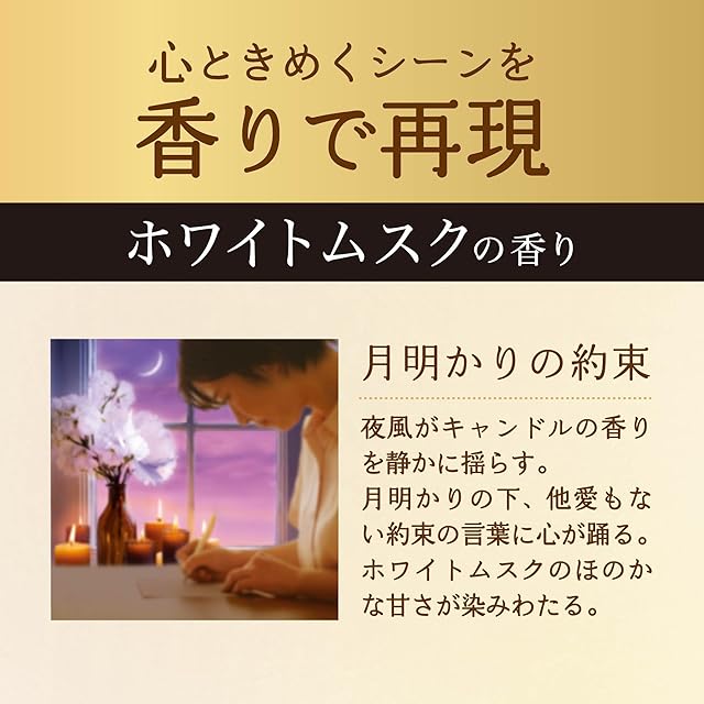 柔軟剤の香りで心ときめくシーンを再現。「月明りの約束」:夜風がキャンドルの香りを静かに揺らす。月明りの下、他愛もない約束の言葉に心が躍る。ホワイトムスクのほのかな甘さが染みわたる。