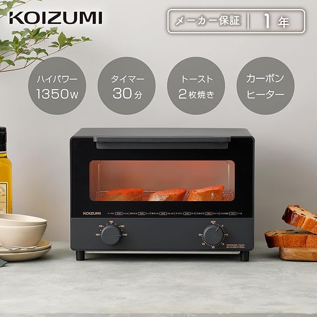 【.co.jp限定】 コイズミ オーブントースター 2枚焼き 1350W カーボンヒーター搭載 無段階温度調節 お手入れカンタン ブラック KOS-1302/K