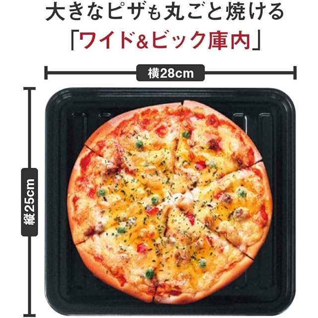 「ワイド&ワイド」お料理の状態がひと目で分かる「ワイドガラス面」。トースト3枚、約25cmピザも焼ける「ワイド&ビック庫内」。