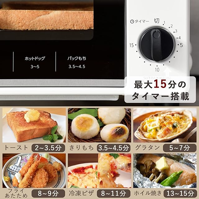 【食材に合わせた調理時間】最大15分まで設定できるタイマー機能搭載。食パンはもちろん、とろーりチーズのピザにこんがりお餅、グラタンなど食材に合わせてお好みで設定してください。