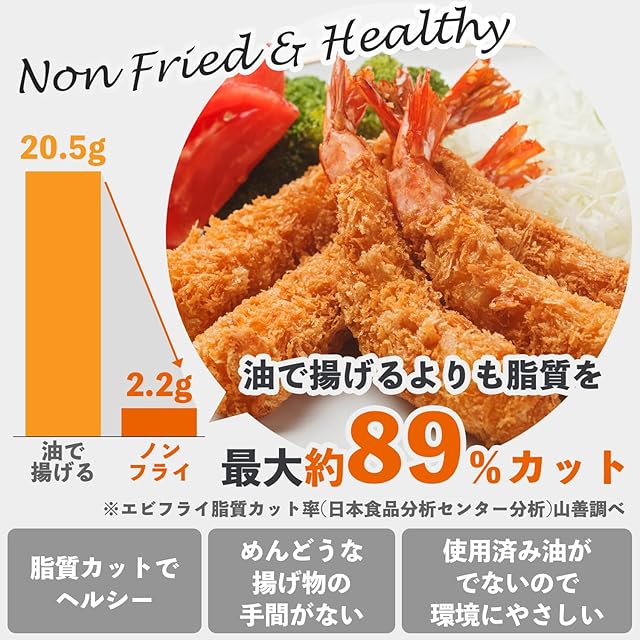 【Wファンの高温熱風がレシピの幅を広げる】Wファンにより、さらに強力な熱風が可能になりました。「オーブンモード」は、本体上部のWファンが上下それぞれ2本ずつ搭載したストレートの「直ヒーター」の熱を対流させることで、温度 のムラを防ぎながら、熱風で包み込むように焼き上げます。食材への火入れも早く、外はカリッと中はジューシーに仕上がります。上部の「S 字ヒーター」を使用する「エアフライモード」では、ノンフライのヘルシーな揚げ物料理が作れます。食用油もいらず、調理時の油はねなどもありません。揚げ物などの温めは「あたためモード」を使用することで、余分な油を落としてサクッと仕上げます。