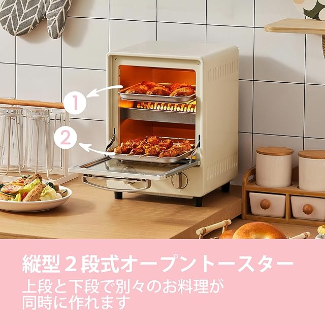 【高性能で多機能】この縦型二層構造のオーブントースターは、複数の異なる料理を同時に加熱できるため、調理プロセスがより効率的で迅速になります。もう一品の料理が完成するのを待つ必要はありません。家族の集まりや友人のパーティーなど、短時間で多くの料理を作りたい人に特に適しています。