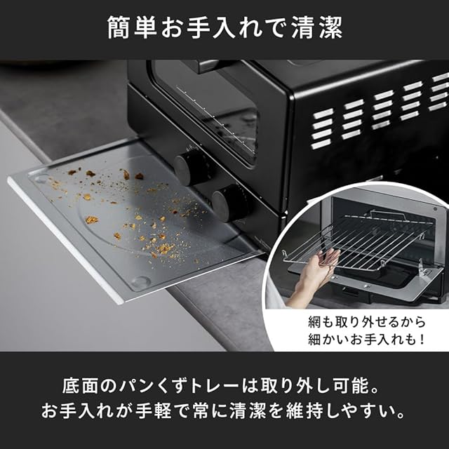 【使いやすいスライドオープンドア】ドアを開けると焼き網が手前に出てくるから取り出しやすい。【庫内のお手入れもスムーズ】パンくずトレーを開くだけで庫内の掃除ができる。