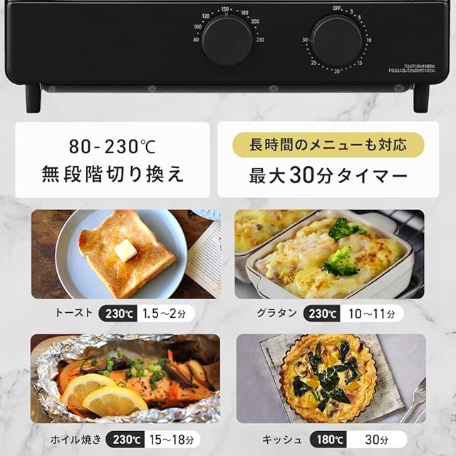 【温度調節可能】最大:1200W/80~230℃無段階切替。素早く均一に焼けるので、トーストは「外はカリッと中はふんわり」に。トースト以外にもピザやクッキーなど、料理にあわせた温度調節ができる。