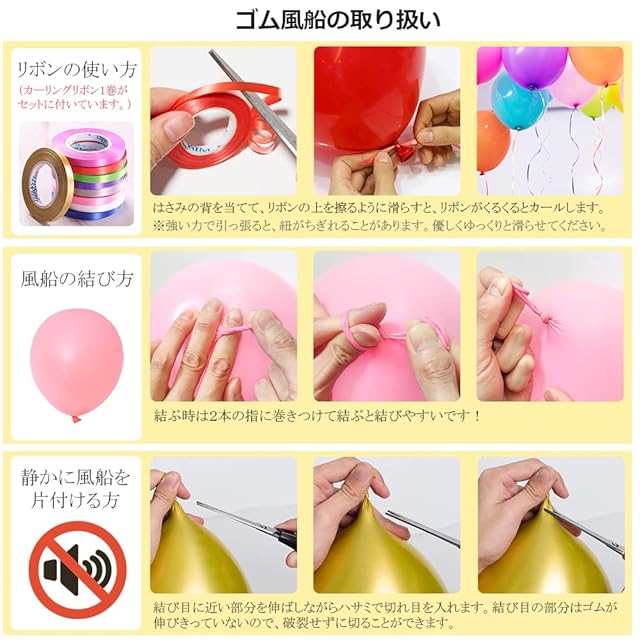 ■風船カラー:5色アソート(予告無くアソート色数に変更が生じる場合があります予めご了承ください。)/内容物 :約50個(粘着シール1枚、リボン1巻、バルーンチェーン1巻付き)/サイズ:10インチ(25cm)/ヘリウムガス、空気用に使用できます。