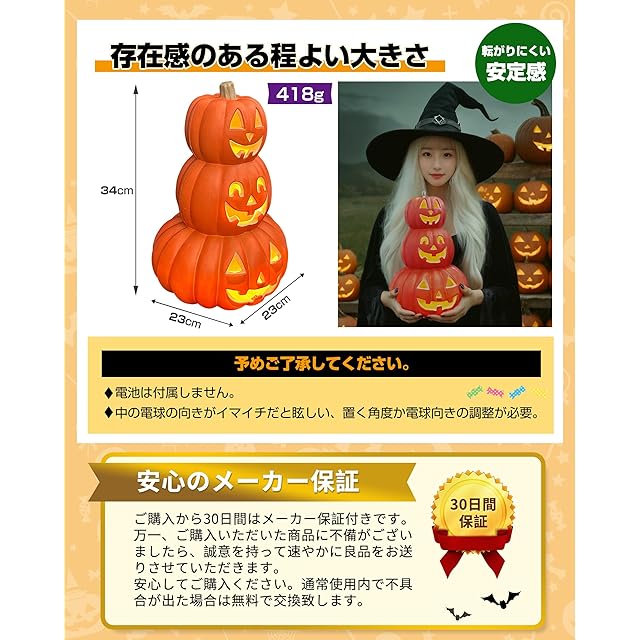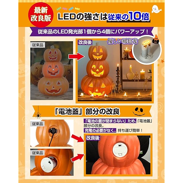 ■【改良内容】<br/> ★★「電池の蓋が閉まらない」の購入者からのフィードバックを頂き、製品の「電池蓋」部分の改良を行いました。★★従来品のLED発光部1個から4個にパワーアップ!<br/> <br/> ■【7つの特長】<br/> ●高輝度省エネLED球を採用、LEDの強さは従来の10倍<br/> ●飛散防止の高密度ポリエチレン(HDPE)素材を使用、環境にやさしい<br/> ●優しい暖色発光で目に刺激しない<br/> ●転がりにくい安定感、重さはわずか約418g<br/> ●存在感のある程よい大きさ、約23×23×34cm<br/> ●繊細な塗装と絶妙な造形で完璧<br/> ●防水仕様+電池式、スイッチ一つで簡単操作<br/> <br/> ■【予めご了承してください。】<br/> ※電池は付属しません。<br/> ※中の電球の向きがイマイチだと眩しい、置く角度か電球向きの調整が必要。<br/> <br/> ■【製品仕様】<br/> ・点灯バターン:点灯消灯のみ(常灯)<br/> ・LED光色:電球色(温かい黄色)<br/> ・サイズ:A型 23×23×34cm<br/> ・重さ(電池無し):約418g<br/> ・素材:高密度ポリエチレン(HDPE)<br/> ・電源:単三電池 2本(別売り)<br/> ★ギフト:ハロウィン専用蓄光タトゥーシール ×1枚<br/> <br/> ■【いろんな場所で大活躍】<br/> 店舗ディスプレイ、マスカレードパーティー、ハロウィーン、カーニバル、コスプレ、スタイリッシュな装飾、子供部屋のインテリア、バーショーなどにに適しています。玄関やお部屋、お店に飾って楽しめます。ジャック・オー・ランタンが楽しいハロウィン/パーティー/新年会/忘年会/仮装/コスプレで盛り上がります。室内屋外兼用です。