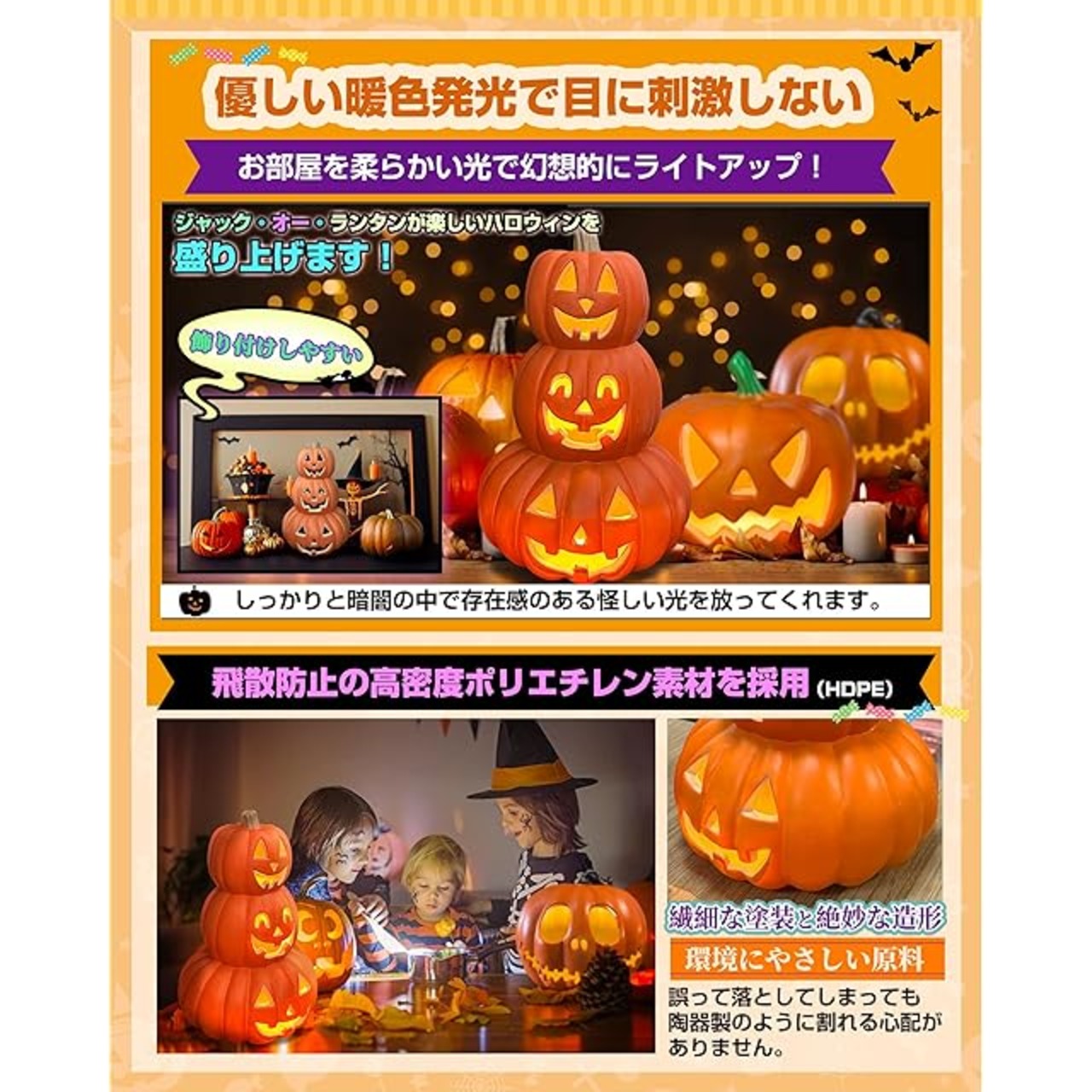【3つ重なったパンプキンランタン】最新発売! ★★「電池の蓋が閉まらない」の購入者からのフィードバックを頂き、製品の「電池蓋」部分の改良を行いました。 ★★従来品のLED発光部1個から4個にパワーアップ!後ろのスイッチを入れると、中のLEDが光り、目と口が光り輝きます(常灯)。※中の電球の向きがイマイチだと眩しい、置く角度か電球向きの調整が必要。パンプキンの大きさ23cm×22cm×21cmと大きいですので存在感があります。 ★★ギフト:1枚のハロウィン専用蓄光タトゥーシール(ランダム配送)をワンセットでお届け致します。