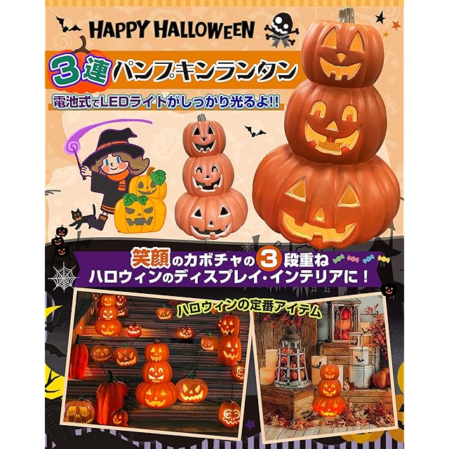 商品名:GOKEI 3連 パンプキンランタン 電池式 LEDライト 3つ重 ジャックオ 置物 カボチャのオブジェ 飾り付け ハロウィングッズ 装飾
