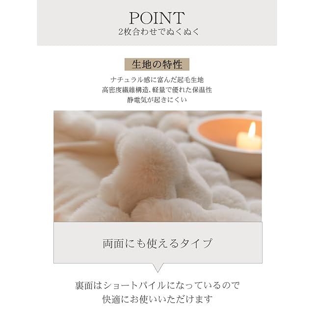 【高品質な素材&二枚合わせ毛布】 VERILADYの毛布はラビットファー風の二枚合わせ仕様で、両面がふわふわな素材。高級感があり、保温性も抜群です。おしゃれなお部屋のアクセントにもなり、寒い冬でも暖かく過ごせるブランケットです。ふんわり柔らかくしっとりとした肌触りで、心も体も温まります。耐久性に優れた生地で、ふわふわな触り心地を長くお楽しみいただけます。