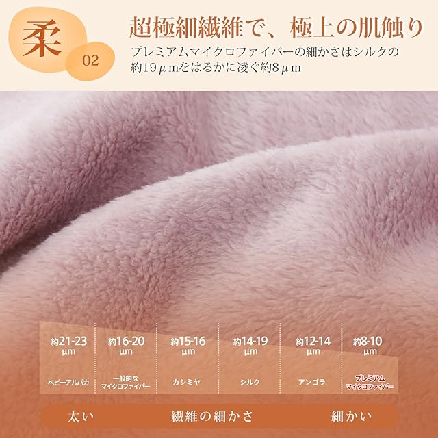 <ふんわり、なめらか>:毛布は高密度フランネルマイクロファイバー生地を採用しています。キメ細やかな繊維が、ふんわりで柔らかな肌触りを与え、体を優しく包み込みます。