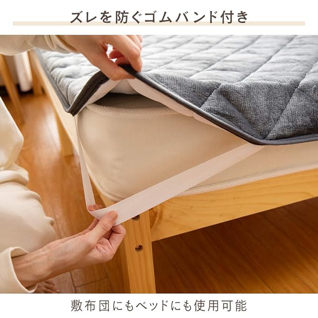 【ズレを防ぐ四隅ゴムバンド付き】敷きパッドの4隅にゴムがついているので、寝ている間のズレを防いでくれる。敷布団にもベッドにも使用可能。