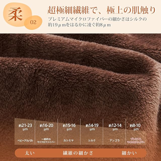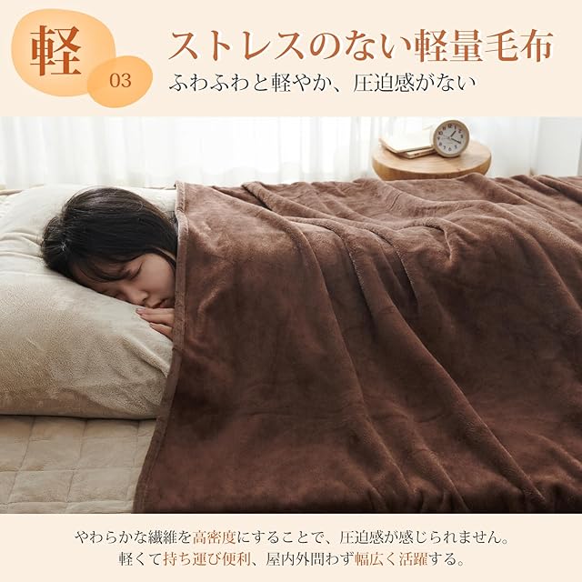 <ふんわり、なめらか>:毛布は高密度フランネルマイクロファイバー生地を採用しています。キメ細やかな繊維が、ふんわりで柔らかな肌触りを与え、体を優しく包み込みます。