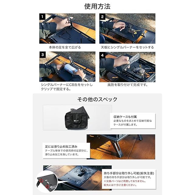 シングルバーナーを安定感あるテーブルへ。【WAQ BURNER MINI TABLE】・SOTO社製ST-310 / 340に対応・風防兼ゴトク付き・IGT規格対応で、テーブル上のごちゃつきを解消しスタイリッシュに。【SOTO社製ST-310 / 340に対応】火力性能の高いST-310や340をテーブルにインストールすることを目的とした本アイテム。BURNER MINI TABLEを使用することで、シングルバーナーにミニテーブルの機能をプラスすることが可能です。【風防兼ゴトク付き】バーナー部分に風の侵入を軽減する風防が付属。風防はそのままゴトクとしても機能するため、直径の大きい調理器具を使用するときも安定感を損ないません。【IGT規格対応】足を折り畳んでWAQマルチローテーブルやIGT規格テーブルにビルトインすれば、見た目の美しいキッチンテーブルが完成。バーナー部分以外はフラットになるため、テーブル上のスペースを更に有効活用が可能です。【その他のスペック】・専用の収納ケースが付属:必要なものをまとめて収納可能なケースが付属します。・足には滑り止め加工済み:テーブル単体での使用時の足部分に、滑り止め加工を施しています。・持ち手部分は取り外し可能(紛失注意):天板の持ち手部分は取り外しが可能です。【商品仕様】「カラー」ブラック「サイズ」自立時:約36 x 25 x 高さ9.3cm 脚収納時:約36 x 25 x 高さ2.2cm「重量」約2.0kg「材質」鉄「内容品」本体 / 風防4枚 / 収納袋 / 日本語説明書 ※本製品にシングルバーナーは付属いたしません。