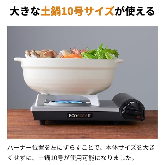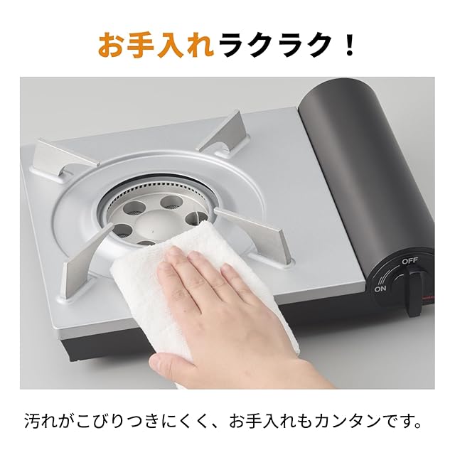 ■内炎式バーナーによるガス消費の抑制 炎が内側に出る内炎式バーナーを採用。鍋底からこぼれるムダ火を抑え、加熱効率が向上。 通常型バーナーに比べて約19%のガス消費量を節約。 ※2016年型「CB-WA-35」との比較。 ■土鍋10号まで使用可能 通常のカセットコンロは土鍋9号までが使用目安でしたが、本製品では土鍋10号が使用可能。 ■高級感のあるデザインと環境配慮 天板に光沢のある耐熱塗装を採用し、先進的でシャープなデザインを実現。 環境にも配慮した仕様。