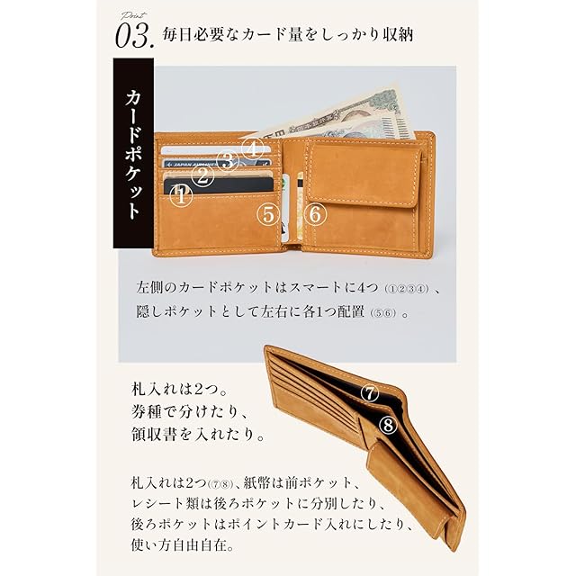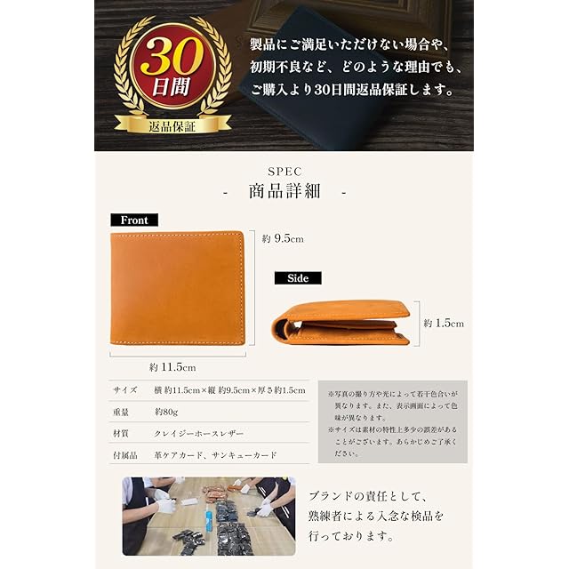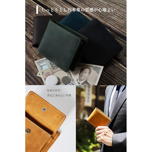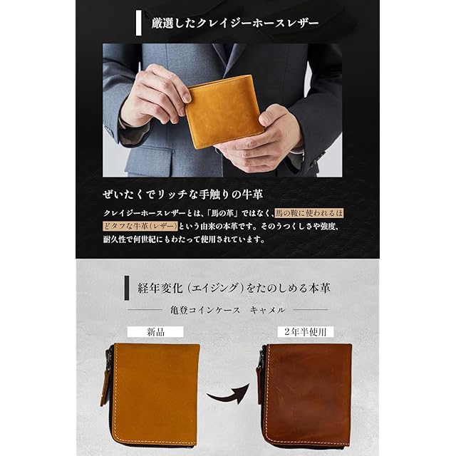 ◆【本革クレイジーホースレザー】牛革の最表面の皮を使用した二つ折り財布。牛革の最表面の皮は繊維が細かく、頑丈で耐久性にすぐれています。本革の中でもクレイジーホースレザーと呼ばれる革を使用して作られています。クレイジーホースレザーは品質の良い牛の原皮(馬の皮ではありません)を使用し、植物性タンニンで鞣した皮でしっとりとしたやや起毛したような質感が特徴的なレザーです。当財布は起毛加工技術を採用し作られており、手触りが滑らかで耐久性にも優れています。「思わず誰かに見せたくなる」そんな革製品を目指して作りました。 <br><br> ◆【カード6枚収納可能】 前面のカードポケットに4枚、小銭入れとカードポケットの裏側に1枚ずつの合計6枚のカードを収納することが出来ます。 <br><br> ◆【薄くてかさばらない】 最厚でも2cmと二つ折り財布としては非常に薄い設計となっています。最も薄い部分は1.5cmの薄さでポケットや鞄にいれても厚みが気になることはない厚さです。 <br><br> ◆【革に刻まれた生きた証】 亀登鞄製作所製品に用いられる革は全て牛革の最表層の革を使用しています。そのため革表面には動物が持っていたさまざまな「生きた証」が見られます。【血筋(ちすじ)】は皮膚の下にある血管が痕として革表面に残ったものです。葉脈のような模様となり革に残ります。【トラ】は原皮のシワや弛みを平らにするためにならした際にできる革の山と谷の部分を染色するとできる染めムラのことです。縞状にできたその染めムラがまるでトラの模様に見えることからトラと呼ばれます。本革にしかない生きた証です。 <br><br> ◆【プレゼント用に】自分用としてはもちろん、大切な人にオシャレな本革の二つ折り財布をプレゼント。入学、卒業、就職、誕生日、クリスマス、バレンタインデー、父の日、母の日、記念日などのお祝いとしてプレゼントにぴったりの財布です。 <br><br> ◆【お知らせ】本製品には高品質な本革クレイジーホースレザーを使用しています。初めは硬く感じられるかもしれませんが、使うほどに手に馴染み、柔らかくなります。長く愛用いただける素材ですので、ぜひお楽しみください。 <br>【サイズ】縦:9.5cm 横:11.5cm 厚:2cm 【カラー】キャメル、こげ茶、ブラック、ブルー、グリーン <br><br> ◆【亀登鞄製作所のこと】 良い製品を手にしたときの喜びはいつだって心弾む体験として思い出に残ります。手に取るのは一つの小さな革製品ですが、それを通して作るたくさんの思い出や経験は一人一人違ってどれもかけがえのないものです。私たちは「革製品を通してそんな経験を販売したい」という思いからこの亀登鞄製作所を立ち上げました。スローガンである「いつも素晴らしい体験を」にもその想いが詰まっています。亀登鞄製作所は製品を手にした時から始まるいく通りものストーリーを想像しながら日々より良い革製品を作り続けています。 <br><br>