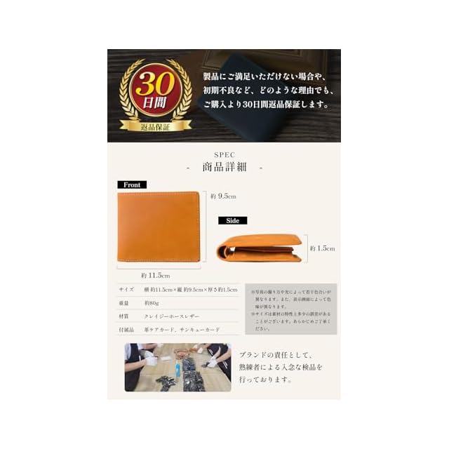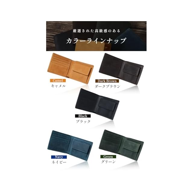 ◆【本革クレイジーホースレザー】牛革の最表面の皮を使用した二つ折り財布。牛革の最表面の皮は繊維が細かく、頑丈で耐久性にすぐれています。本革の中でもクレイジーホースレザーと呼ばれる革を使用して作られています。クレイジーホースレザーは品質の良い牛の原皮(馬の皮ではありません)を使用し、植物性タンニンで鞣した皮でしっとりとしたやや起毛したような質感が特徴的なレザーです。当財布は起毛加工技術を採用し作られており、手触りが滑らかで耐久性にも優れています。「思わず誰かに見せたくなる」そんな革製品を目指して作りました。 <br><br> ◆【カード6枚収納可能】 前面のカードポケットに4枚、小銭入れとカードポケットの裏側に1枚ずつの合計6枚のカードを収納することが出来ます。 <br><br> ◆【薄くてかさばらない】 最厚でも2cmと二つ折り財布としては非常に薄い設計となっています。最も薄い部分は1.5cmの薄さでポケットや鞄にいれても厚みが気になることはない厚さです。 <br><br> ◆【革に刻まれた生きた証】 亀登鞄製作所製品に用いられる革は全て牛革の最表層の革を使用しています。そのため革表面には動物が持っていたさまざまな「生きた証」が見られます。【血筋(ちすじ)】は皮膚の下にある血管が痕として革表面に残ったものです。葉脈のような模様となり革に残ります。【トラ】は原皮のシワや弛みを平らにするためにならした際にできる革の山と谷の部分を染色するとできる染めムラのことです。縞状にできたその染めムラがまるでトラの模様に見えることからトラと呼ばれます。本革にしかない生きた証です。 <br><br> ◆【プレゼント用に】自分用としてはもちろん、大切な人にオシャレな本革の二つ折り財布をプレゼント。入学、卒業、就職、誕生日、クリスマス、バレンタインデー、父の日、母の日、記念日などのお祝いとしてプレゼントにぴったりの財布です。 <br><br> ◆【お知らせ】本製品には高品質な本革クレイジーホースレザーを使用しています。初めは硬く感じられるかもしれませんが、使うほどに手に馴染み、柔らかくなります。長く愛用いただける素材ですので、ぜひお楽しみください。 <br>【サイズ】縦:9.5cm 横:11.5cm 厚:2cm 【カラー】キャメル、こげ茶、ブラック、ブルー、グリーン <br><br> ◆【亀登鞄製作所のこと】 良い製品を手にしたときの喜びはいつだって心弾む体験として思い出に残ります。手に取るのは一つの小さな革製品ですが、それを通して作るたくさんの思い出や経験は一人一人違ってどれもかけがえのないものです。私たちは「革製品を通してそんな経験を販売したい」という思いからこの亀登鞄製作所を立ち上げました。スローガンである「いつも素晴らしい体験を」にもその想いが詰まっています。亀登鞄製作所は製品を手にした時から始まるいく通りものストーリーを想像しながら日々より良い革製品を作り続けています。 <br><br>