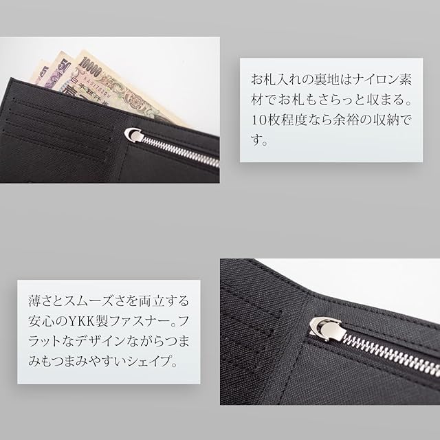 [スペック] ・お札入れ × 1 ・小銭入れ × 1 ・カードポケット × 6 ・日本製YKKファスナー 【サイズ】・縦 90mm × 横 105mm × 厚み 10mm・重さ 46g 【素材】牛革