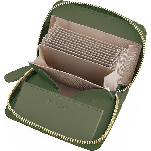 [RafiCaro] ミニ財布 お札が折れない 財布 レディース メンズ 二つ折り財布 大容量 じゃばら カードケース ボックス型 小銭入れ YKKファスナー 牛革 小さい財布 オリーブ