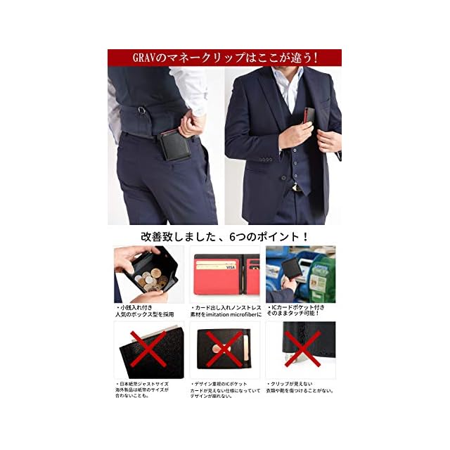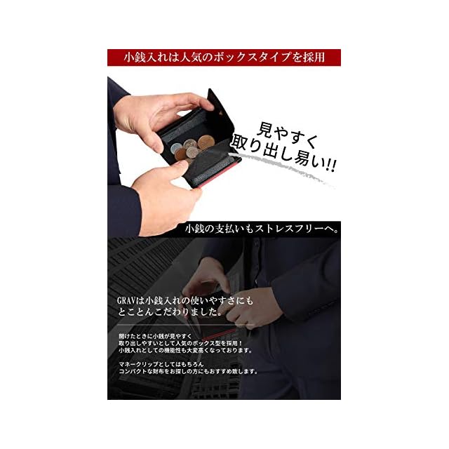 マネークリップ 小銭入れ付き メンズ 財布 二つ折り (ICカードポケット 隠しポケット付き)小銭入れ カード コインケース ボックス型 薄い 薄型 コンパクト 二つ折り財布 革 レザー 小銭 小銭入れ ICカード パスケース クリップ 札ばさみ 札はさみ 札入れ カードケース レッド 赤 ブラック 黒 【 オールインワンのマネークリップ 】マネークリップに小銭入れとして人気の高いボックスタイプの小銭入れを採用した逸品。 カードポケットはICカードポケットに隠しポケットも装備の合計6ポケット。 スマートに立ち振る舞う男性の為の マネークリップが遂に誕生です! 【 マネークリップの小銭の収納に困っていませんか? 】マネークリップのコンパクトさはそのままに小銭までしっかり収納 マネークリップのコンパクトさと財布の収納力を兼ね備えた逸品になっております。 薄い財布またはコンパクトなお財布をお探しの方にもおすすめ致します。 【 見やすい×取り出しやすいボックス型小銭入れを採用 】ただ単に小銭のスペースがあるわけではありません。GRAVでは全ての小銭がパッと見えて 取り出しやすい 小銭入れとして人気のタイプ ボックス型小銭入れを採用致しました。 小銭の支払いもストレスフリーへ。 【 サイズ×素材 】サイズ:縦88mm、横115mm、厚さ17mm 日本紙幣ジャストサイズ!海外製品には日本紙幣に対応していない規格もありますのでお気をつけ下さい。 素材:高品質PUレザー カードポケット部分はimitation microfiberを採用!カードの出し入れのしやすさを改善いたしました。 仕様:内側 カード入れ×4、外側 ICカード入れ×1、隠しポケット×1 BOX型小銭入れ付き 素材と色のコントラストが高級感をさらにUP! ワンランク上の存在感を醸し出す マネークリップとなっております。