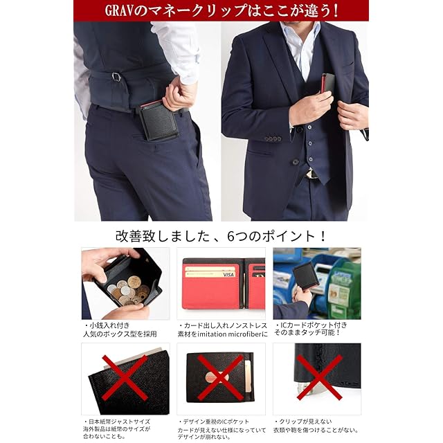 マネークリップ 小銭入れ付き メンズ 財布 二つ折り (ICカードポケット 隠しポケット付き)小銭入れ カード コインケース ボックス型 薄い 薄型 コンパクト 二つ折り財布 革 レザー 小銭 小銭入れ ICカード パスケース クリップ 札ばさみ 札はさみ 札入れ カードケース レッド 赤 ブラック 黒 【 オールインワンのマネークリップ 】マネークリップに小銭入れとして人気の高いボックスタイプの小銭入れを採用した逸品。 カードポケットはICカードポケットに隠しポケットも装備の合計6ポケット。 スマートに立ち振る舞う男性の為の マネークリップが遂に誕生です! 【 マネークリップの小銭の収納に困っていませんか? 】マネークリップのコンパクトさはそのままに小銭までしっかり収納 マネークリップのコンパクトさと財布の収納力を兼ね備えた逸品になっております。 薄い財布またはコンパクトなお財布をお探しの方にもおすすめ致します。 【 見やすい×取り出しやすいボックス型小銭入れを採用 】ただ単に小銭のスペースがあるわけではありません。GRAVでは全ての小銭がパッと見えて 取り出しやすい 小銭入れとして人気のタイプ ボックス型小銭入れを採用致しました。 小銭の支払いもストレスフリーへ。 【 サイズ×素材 】サイズ:縦88mm、横115mm、厚さ17mm 日本紙幣ジャストサイズ!海外製品には日本紙幣に対応していない規格もありますのでお気をつけ下さい。 素材:高品質PUレザー カードポケット部分はimitation microfiberを採用!カードの出し入れのしやすさを改善いたしました。 仕様:内側 カード入れ×4、外側 ICカード入れ×1、隠しポケット×1 BOX型小銭入れ付き 素材と色のコントラストが高級感をさらにUP! ワンランク上の存在感を醸し出す マネークリップとなっております。