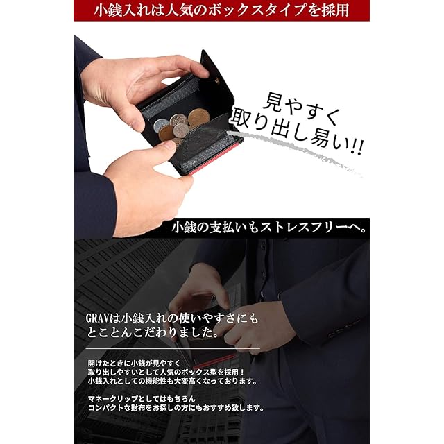 ✅【 見やすい×取り出しやすいボックス型小銭入れを採用 】ただ単に小銭のスペースがあるわけではありません。GRAVでは全ての小銭がパッと見えて 取り出しやすい 小銭入れとして人気のタイプ ボックス型小銭入れを採用致しました。 小銭の支払いもストレスフリーへ。