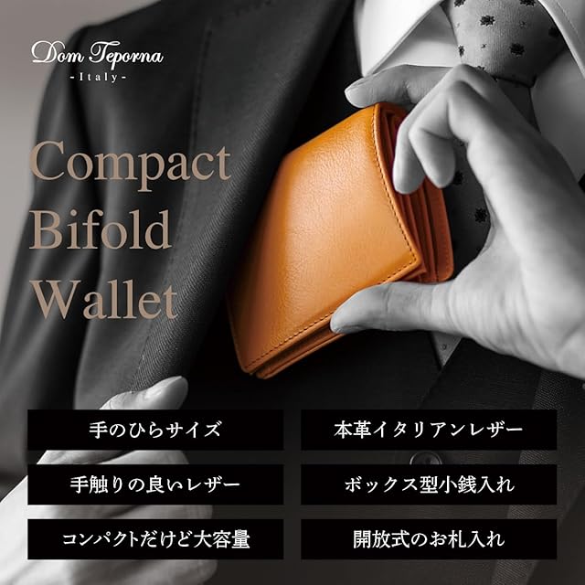 【ブランド】 Dom Teporna Italy - ドンテポーナ イタリー - 【スペック】 ・小銭入れ × 1 ・お札入れ × 1 ・カードポケット ×6 ・フリーポケット ×2 ・外ポケット ×1 【サイズ】 ・縦 106mm × 横 95mm × 厚み 15mm ・重さ 80g 【素材】 ・表側:本革 イタリアンレザー ・内側:マイクロファイバー 【コンパクトでもしっかり大容量】 一般的な二つ折り財布よりもひと回り小さいコンパクトボディに「充実の収納力」と「使い勝手の良さ」を兼ね備えた大人の財布。 計6か所のカードポケットで18枚のカードを収納可能です(1ポケット3枚まで)。 ※推奨枚数のカードを収納した場合、厚みが出やすくなりますのであらかじめご了承ください。 アクセスしやすいボックス型小銭入れと大きく開くお札入れで、支払いもスマートに。外ポケットは駐車券や領収証などの一時保管に便利。 長財布から二つ折り財布に買い替えを検討されている方にもおすすめのコンパクト財布です。 【ビジネスシーンにもぴったりのシックなフォルム】 表側は柔らかいイタリアンレザーを贅沢に使用しています。使うごとに変化する風合いを楽しめるのは本革ならではの魅力。内側には耐久性に優れた高品質マイクロファイバーを採用し、長くご愛用いただけます。 メンズ レディース 問わず人気の9カラーをラインナップ。かわいい、おしゃれ、クール、カジュアル、ビジネス、フォーマルなどスタイルに合わせてお選び頂けます。 記念日 などの プレゼント 母の日 父の日 バレンタインデー ホワイトデー 誕生日 クリスマス 等の ギフト にも おすすめ です。brown ブラウン / darkbrown ダークブラウン / green グリーン / navy ネイビー / black ブラック / blackgrey ブラックグレー / blackdarkbrown ブラックダークブラウン / blackred ブラックレッド / blackbordeaux ブラックボルドー