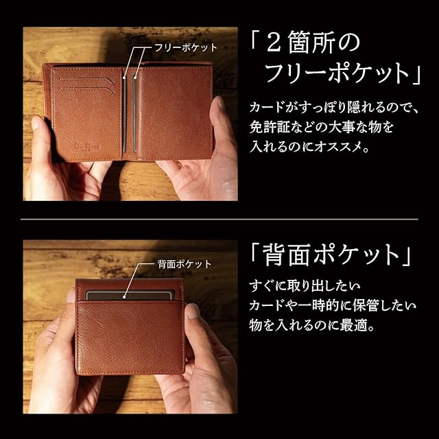 【スペック】 ・小銭入れ × 1 ・お札入れ × 1 ・カードポケット ×6 ・フリーポケット ×2 ・外ポケット ×1 【サイズ】 ・縦 106mm × 横 95mm × 厚み 15mm ・重さ 80g 【素材】 ・表側:本革 イタリアンレザー ・内側:マイクロファイバー
