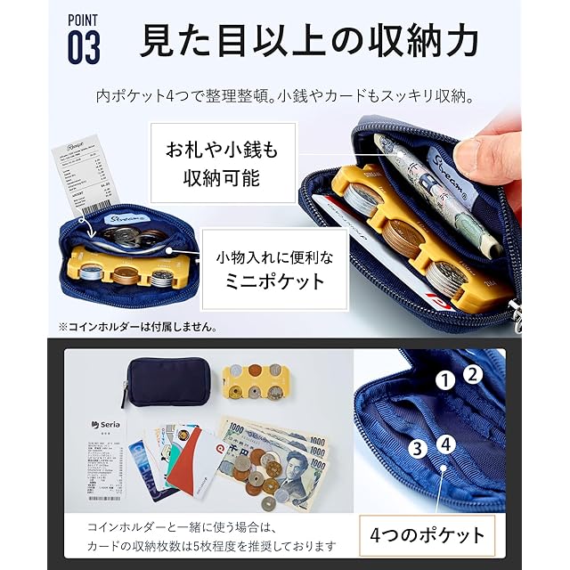 【豊富な収納スペース】4つのポケットが付いているため、使い方は様々です!例えば、小さなお財布として使用したり、ワイヤレスイヤホンのケースとして利用したり、充電ケーブルや車のスマートキーを収納したりすることができます。幅広い用途で活躍する便利なアイテムです。