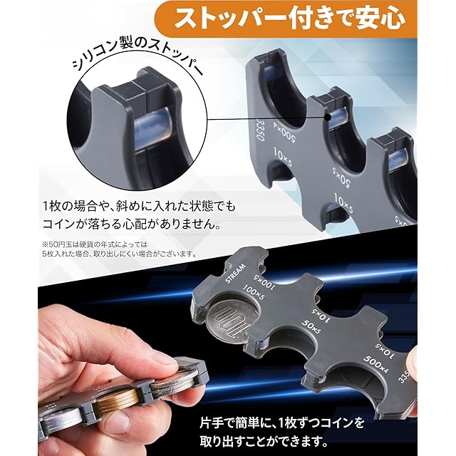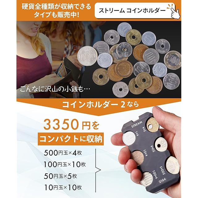 【収納力が大幅アップ】500円×4枚・100円×10枚・50円×5枚・10円×10枚(合計3,350円)が収納できます。