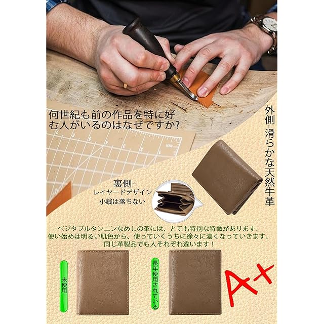 < b >【イタリアから輸入した植物タンニンなめしのオイルレザー素材】< /b >< br >ベジタブルタンニンレザーとは、牛革の第一層を植物エキスでなめした革です。本来の特徴は硬く、色が鮮やかであることです。しかし、時間が経つにつれて、色は徐々に暗くなり、緑青に変わります。そしてユーザビリティはますます使いやすくなります。そのため「呼吸する革」とも呼ばれています。<br>< /b >【ユニークでスタイリッシュな外観】< /b >< br >内側も外側も上質な植物タンニン鞣しの天然皮革を使用した、目を引く財布です。コインバッグはレイヤードデザインになっており、収納しやすく、使いやすくなっています。金色のジッパーは強い視覚的インパクトを与え、使用中に他の人の注目を集めることができます。<br>< /b >【持ち運びが容易】< /b >< br >財布のサイズは手のひらにフィットするように設計されており、手に持ったり、バッグに入れたりしやすいです。あらゆる機会に簡単に対応でき、あなたの生活に優雅さと利便性を加えます。