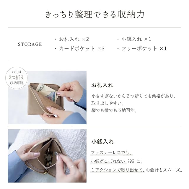 【 使用時の所作を美しく 】小さな財布の秘密は、小銭入れ部分のファスナーを取り除いたスマートなデザイン。外側のファスナーを開けるだけで、コイン/お札/カードをすぐに取り出せます。会計時の無駄なアクションが不要なので,見た目がスマートでスタイリッシュさを演出する優秀なアイテムです。もちろん、閉めた状態でサイフを逆さまにして振ってもコインが飛び出さないようデザインされています。