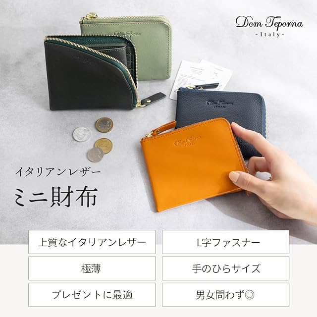 [ブランド] Dom Teporna Italy - ドンテポーナ イタリー - [スペック] ・お札入れ×2・小銭入れ×1・カードケース×3・フリーポケット×1 [素材]・アウター:本革 イタリアンレザー インナー:PUレザー [サイズ] ・縦 100mm × 横 120mm × 厚み 7mm ・重さ 65g [素材] 本革 イタリアンレザー 【 人気の薄型 L字ファスナー財布 】驚くほど薄いL字財布。出来る限り無駄を省き、使いやすさと薄さにこだわった設計の短財布です。このミニ財布はメイン財布としてはもちろん、パーティー用の小さなクラッチバック等の中にも馴染むので、サブ財布としても最適です。 【 使用時の所作を美しく 】小さな財布の秘密は、小銭入れ部分のファスナーを取り除いたスマートなデザイン。外側のファスナーを開けるだけで、コイン/お札/カードをすぐに取り出せます。会計時の無駄なアクションが不要なので,見た目がスマートでスタイリッシュさを演出する優秀なアイテムです。もちろん、閉めた状態でサイフを逆さまにして振ってもコインが飛び出さないようデザインされています。 レザーの質感を生かしたユニセックスに選べる9カラーのラインナップです。 かわいい、おしゃれ、クール、カジュアル、ビジネス、フォーマルなどスタイル問わずにお選び頂けます。 Black (ブラック)/ Navy (ネイビー) / Brown (ブラウン) / Green (グリーン) / Dustyblue (ダスティブルー) / Olive (オリーブ) / Etain (エタン) / Greige (グレージュ) / Dustypink (ダスティピンク)