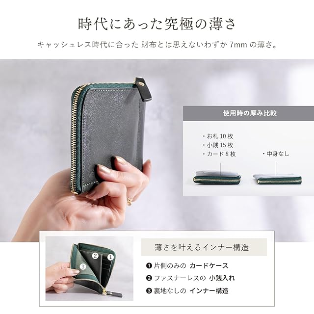 【 使用時の所作を美しく 】小さな財布の秘密は、小銭入れ部分のファスナーを取り除いたスマートなデザイン。外側のファスナーを開けるだけで、コイン/お札/カードをすぐに取り出せます。会計時の無駄なアクションが不要なので,見た目がスマートでスタイリッシュさを演出する優秀なアイテムです。もちろん、閉めた状態でサイフを逆さまにして振ってもコインが飛び出さないようデザインされています。