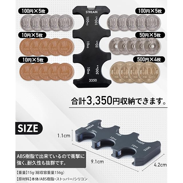 【収納力が大幅アップ】500円×4枚・100円×10枚・50円×5枚・10円×10枚(合計3,350円)が収納できます。