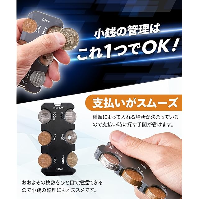 【スマートな小銭入れ】これひとつで小銭管理は完璧!片手でコインが取り出せる、スリムで軽量な便利コインホルダー。 各コインは種類ごとに決まった場所に収納されているので、支払い時に必要なコインをすぐに取り出せてとてもスムーズです。
