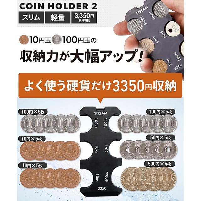 【収納力が大幅アップ】500円×4枚・100円×10枚・50円×5枚・10円×10枚(合計3,350円)が収納できます。