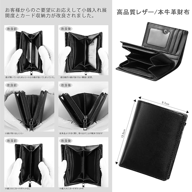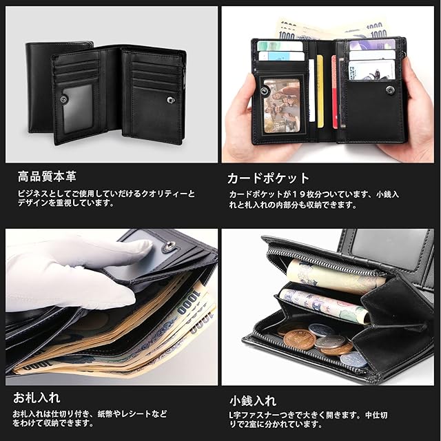 【ポイント2-大容量で、収納抜群】:カード、お札、コインケースと分かれた収納は、 クレジットカードや領収書などがしっかり入り、管理しやすく便利です。L字型ファスナー式小銭入れで、コインの出し入れはしやすいです。