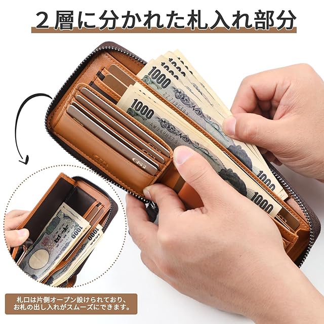 ▶【ポイント2-大容量で、収納抜群】:使うほどに手になじむ、本革仕様のメンズ二つ折り財布。カード、お札、コインケースと分かれた収納は、 クレジットカードや領収書などがしっかり入り、管理しやすく便利です。