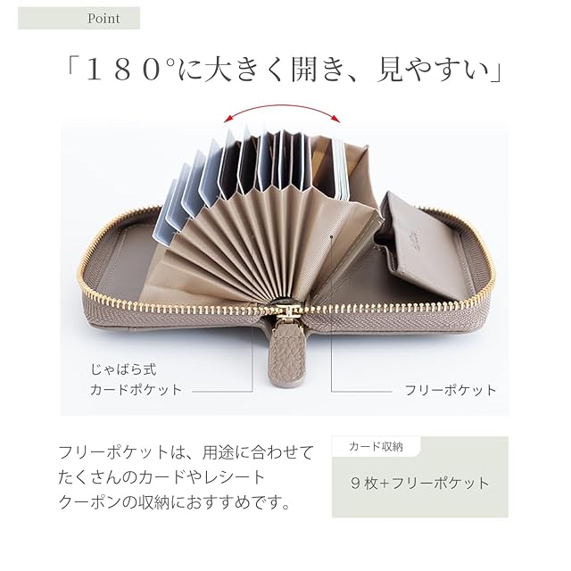 【カードも小銭もたっぷり収納】コンパクトなボディに、使いやすさのための工夫を詰め込みました。じゃばら式カードポケットでたっぷり大容量。ラウンドファスナーを開けば180度広がるので、使いたいカードが一目瞭然。小銭入れは便利なボックス型です。