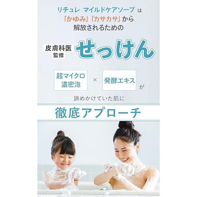 RETURE ( リチュレ ) のマイルドケアソープは センシティブな 敏感肌 の方向けの 洗顔石鹸 です。 超濃密 な マイクロバブル が 摩擦レス 洗顔 を実現。肌への刺激を極限までゼロにしました。さらに肌を整える6つの発酵エキスや保湿力の高いタマヌオイルを配合。汚れだけを優しく落としながら、お肌のバランスを整えます。<br> 【内容量(1箱あたり)】:50ml <br>【サイズ】: 縦5.8cm 横5.8cm 高さ1.7cm <br>【使い方】:手のひらと顔をぬらしてからよく泡立て、泡で肌を包み込むように洗顔し、充分にすすいでください。泡だてネットをご使用いただくとより濃密な泡を立てることができます。<br>【使用上の注意】:お肌に異常が生じていないかよく注意して使用してください。お肌に合わないときすなわち次のような場合は使用を中止してください。そのまま使用を続けますと、症状を悪化させることがありますので、皮膚科専門医等にご相談されることをおすすめします。 使用中、赤み、はれ、かゆみ、刺激、色抜け(白斑等)や黒ずみ等の異常があらわれた場合。 使用したお肌に、直接日光があたって上記のような異常があらわれた場合。<br>【保存方法】:高温多湿を避け、直射日光の当たらない冷暗所での保存をお願いします。また、石鹸を溶けにくくするための成分(アルコール)を不使用なので、使用後は水分をよく切り、石鹸ケースに入れるなどして保管をお願いします。<br> 【原材料】:カリ含有石ケン素地、水、DPG、スクロース、グリセリン、ソルビトール、ホホバ油、ラウラミドプロピルベタイン、エチドロン酸4Na、コシロノセンダングサエキス、テリハボク種子油、バチルス/マコモ発酵液、ブッソウゲ葉エキス、クズ根エキス、ヨモギエキス、黒砂糖、海塩、トウキンセンカ花エキス