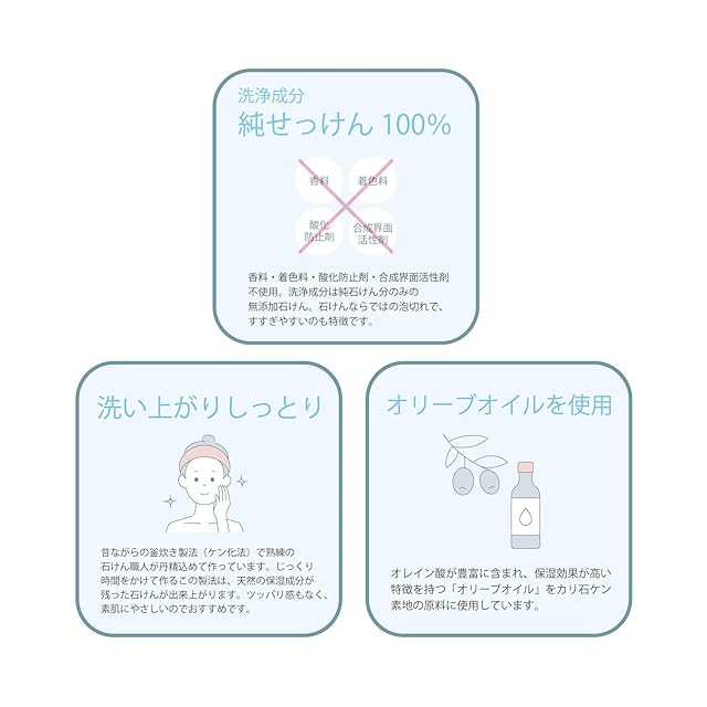 ・オレイン酸が豊富に含まれ、保湿効果が高い特徴を持つオリーブオイルをカリ石けん素地の原料に使用。