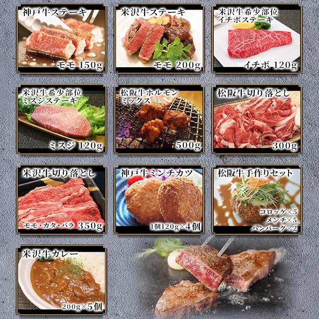 コース種類:日本三大和牛の3ブランド(松阪牛・神戸牛・米沢牛)19商品の中からお好きな牛肉を1つお選びいただけます。・すき焼き・しゃぶしゃぶ・焼肉・ステーキ・ホルモン・切り落とし・コロッケ・ミンチカツ・カレーなど