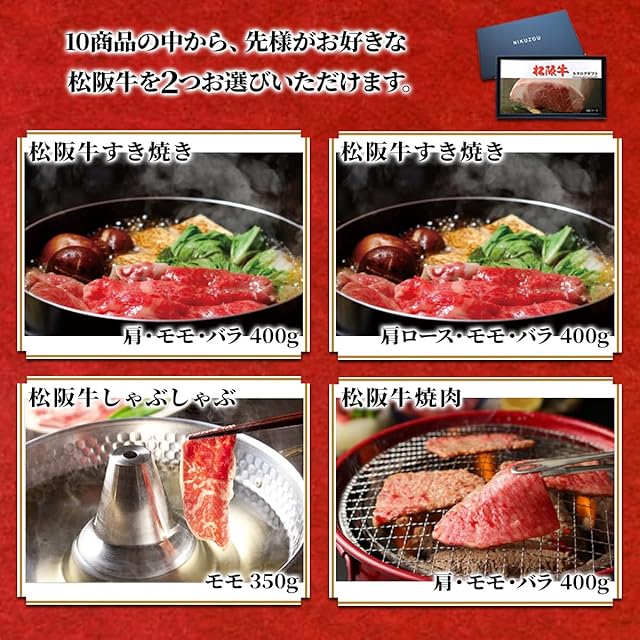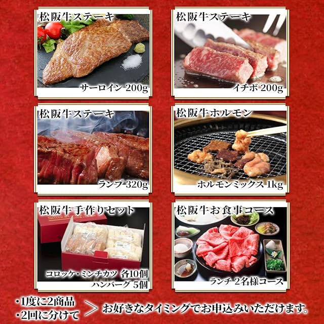 松阪牛カタログギフトです。7コース10商品の中からお好きな松阪牛を2つお選びいただけます。「1度に2商品を注文」「有効期限の6ヶ月以内に2回に分けて注文」どちらでも対応可能です。