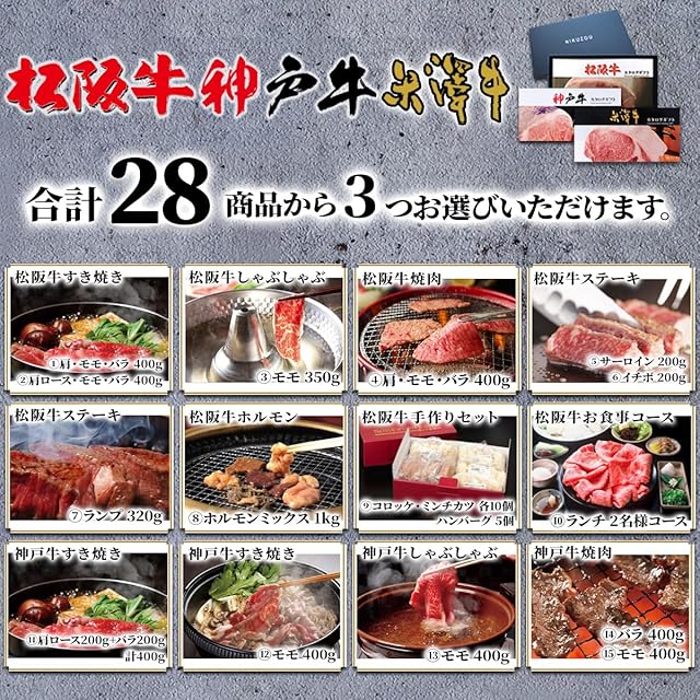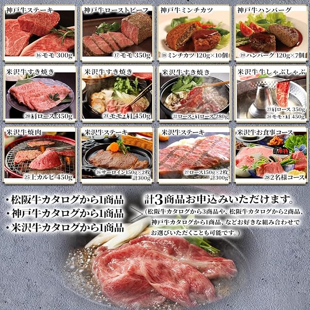 商品詳細:松阪牛、神戸牛、米沢牛カタログギフトです。