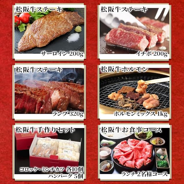 コース種類:すき焼き肉・しゃぶしゃぶ肉・焼肉・ステーキ・ホルモンミックス・手作りセット・松阪牛お食事コース(2名様)7コース10商品の中からお好きな松阪牛を1つお選びいただけます。